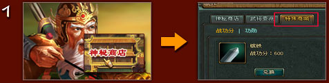 1)在特殊商城中,玩家可以使用自身拥有的“战功分”、 “功勋”两个属性兑换相应的道具。
